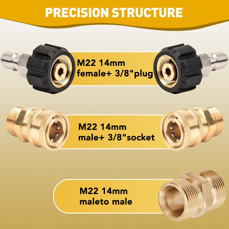 Package include - Including 1 x pressure washer hose 50 feet, 1 x coupler (M22 14mm maleto male) and 2 x adapter sets (M22 14mm female + 3/8" plug, M22 14mm male + 3/8" socket)