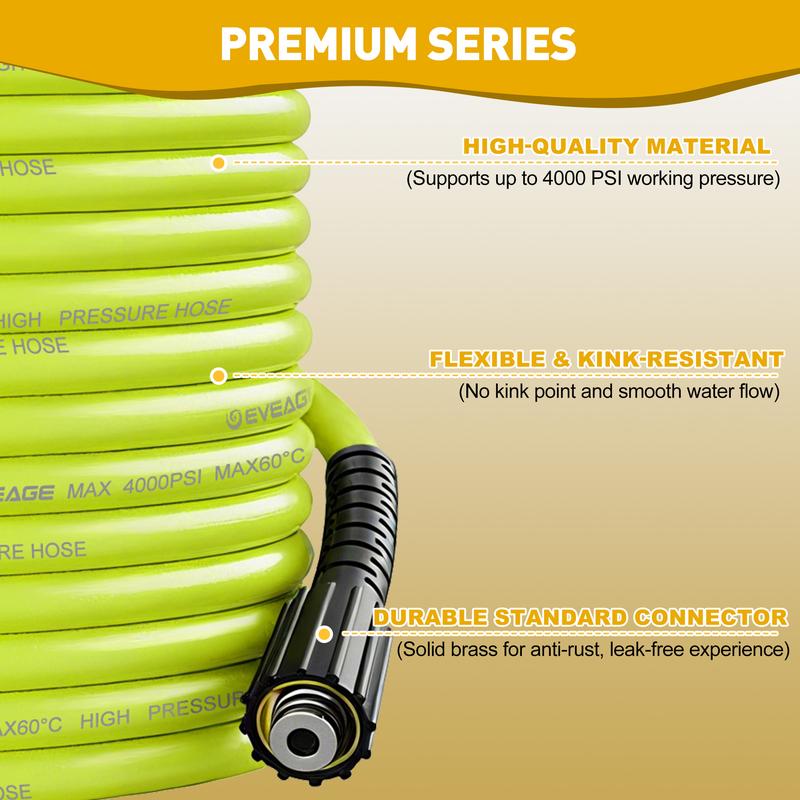 Pressure Washer Replacement Hose- 50FT high-performance hose, power washer hose 50 ft is made from premium quality, durable, weather and abrasion-resistant material. Easy to carry, drag and roll up. Non marking and Not easily kinked.